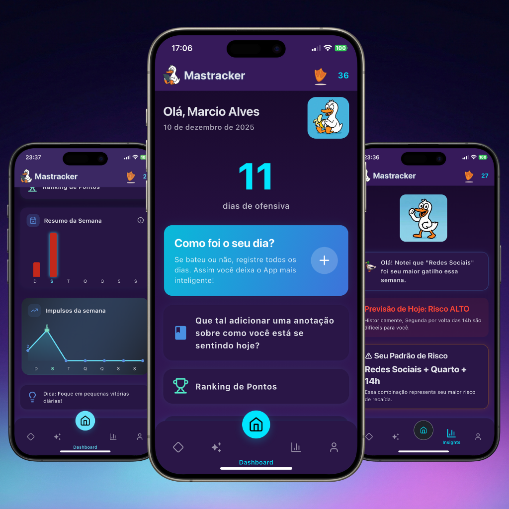 "Depois de anos preso no ciclo, o Mastracker me deu as ferramentas para entender meus gatilhos. Hoje, tenho mais energia e meu foco no trabalho nunca foi tão bom."
